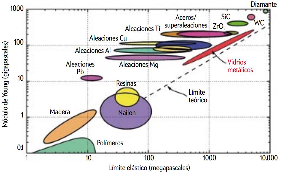 Degut a la seva estructura amorfa, les propietats dels vidres metàl·lics s’acosten més a les del diamant que no pas a les dels aliatges metàl·lics tradicionals, essent un dels materials més durs dels que es coneixen, tal i com veiem representat en aquest diagrama. El mòdul de Young quantifica les deformacions elàstiques que pateix un material sota l’acció d’una força externa. Per altra banda, el límit elàstic és una mesura de la tensió màxima que pot suportar un material abans de deformar-se de forma permanent i és proporcional a la duresa.