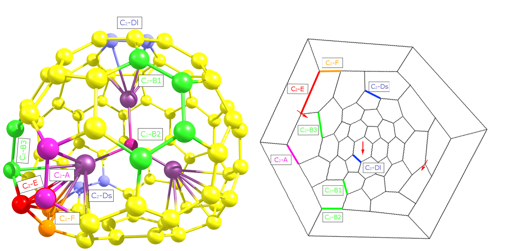 – La segona raó és purament científica. Els ful·lerens són estructures de carboni més o menys esfèriques que contenen anells de cinc i de sis membres. Fins al descobriment del C72Cl4 tots els ful·lerens buits (sense cap àtom en el seu interior) havien seguit la regla del pentagon aïllat que diu que els ful·lerens més estables (i, per tant, els que s’acaben formant preferentment) són els que tenen els anells de cins aïllats per anells de sis, és a dir, no hi ha dos anells de cinc en contacte directe donat que les unions de dos anells de cinc provoquen elevada tensió d’enllaç local. Aquesta regla havia funcionat perfectament per tots els ful·lerens buits descoberts fins aquest moment. Les versions no-IPR de tots els ful·lerens buits descoberts fins aquest moment eren menys estables que els seus isomers IPR. Es important destacar la paraula “buit” perquè en el cas dels ful·lerens endoèdrics (ful·lerens que tenen atrapats àtoms o molècules en el seu interior) ja es coneixia de feia temps que la regla fallava sovint. Un exemple el tenim en el ful·lerè endoèdric no-IPR Y3N@C2-C78 (veure Figura) que és més estable que el ful·lerè endoèdric IPR Y3N@D3h-C78, però n’hi ha molts d’altres. Permeteu-me un parèntesis per dir que la reactivitat d’aquests dos isomers, Y3N@D3h-C78 i Y3N@C2-C78, ha estat recentment estudiada per Sílvia Osuna i els seus dos directors de Tesi (JACS, 2009, 131, 129) a l’Institut de Química Computacional.