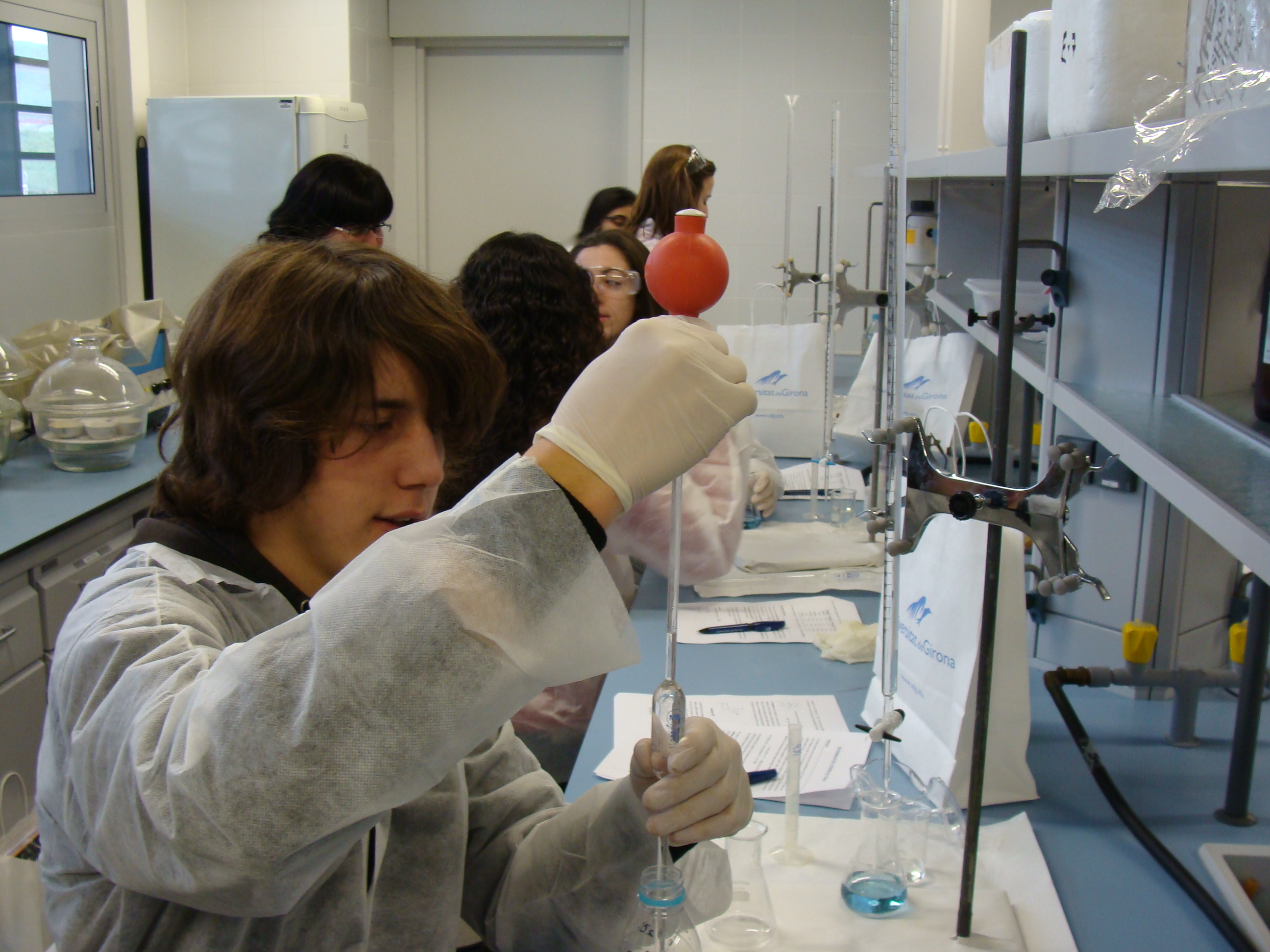 La setmana passada, de dilluns 24 a divendres 28 de gener, uns 214 estudiants de centres de secundària de l’àmbit territorial de la Universitat de Girona, varen participar en les Pràctiques a Grups Classe que organitzem des del Departament de Química de la UdG. Aquest any els tallers han estat Un Remei pel Mal de Cap, on els estudiants podien analitzar i identificar els components d’un medicament; El Color dels Halògens, en el que es comparava el poder redox del clorur, bromur i iodur; i Quina Aigua és més Dura?, on analitzaven la duresa de diferents mostres d’aigua.