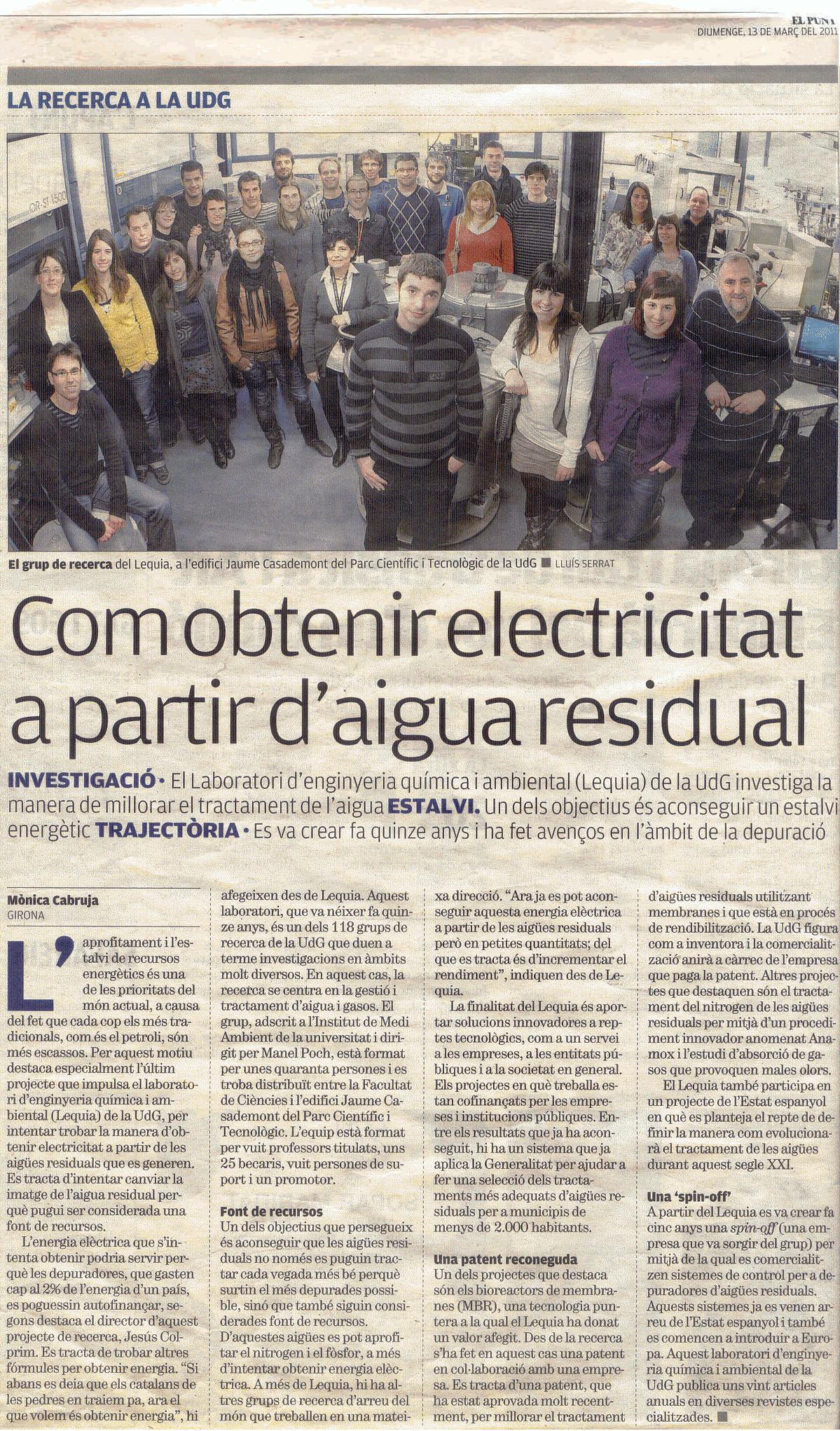 Ahir, diumenge 13 de març, els nostres companys i companyes del grup de recerca del Laboratori d’Enginyeria Química i Ambiental (LEQUIA) varen sortir a pàgina sencera d’ El Punt Diari.