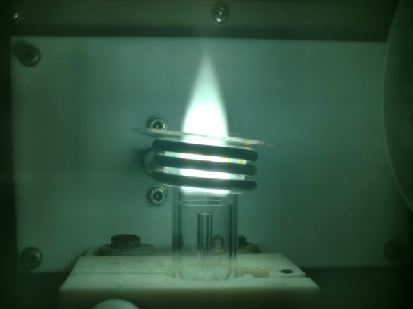 Precisament, l’espectacular foto de la torxa de plasma, generada sobre el tub de quars i la bobina d’inducció (en veiem 3 voltes), plasma resultat d’Ar ionitzat i que es troba a una temperatura d’entre 6000 i 10000 K; és la 14a Foto Química de la Setmana.