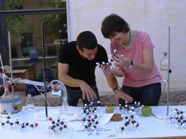 Al laboratori de les olors, situat al pati del rectorat de la UdG, heu pogut gaudir de la presència de la química a través de les plantes i flors, per la seva olor, color o les seves propietats medicinals. Mitjançant els immensos models moleculars que heu trobat al bell mig del pati, hem vist, tocat i flairat la importància de l’estereoisomeria en la molècula de llimonè (on un dels enantiòmers produeix la olor de la llimona i l’altre la de la taronja).