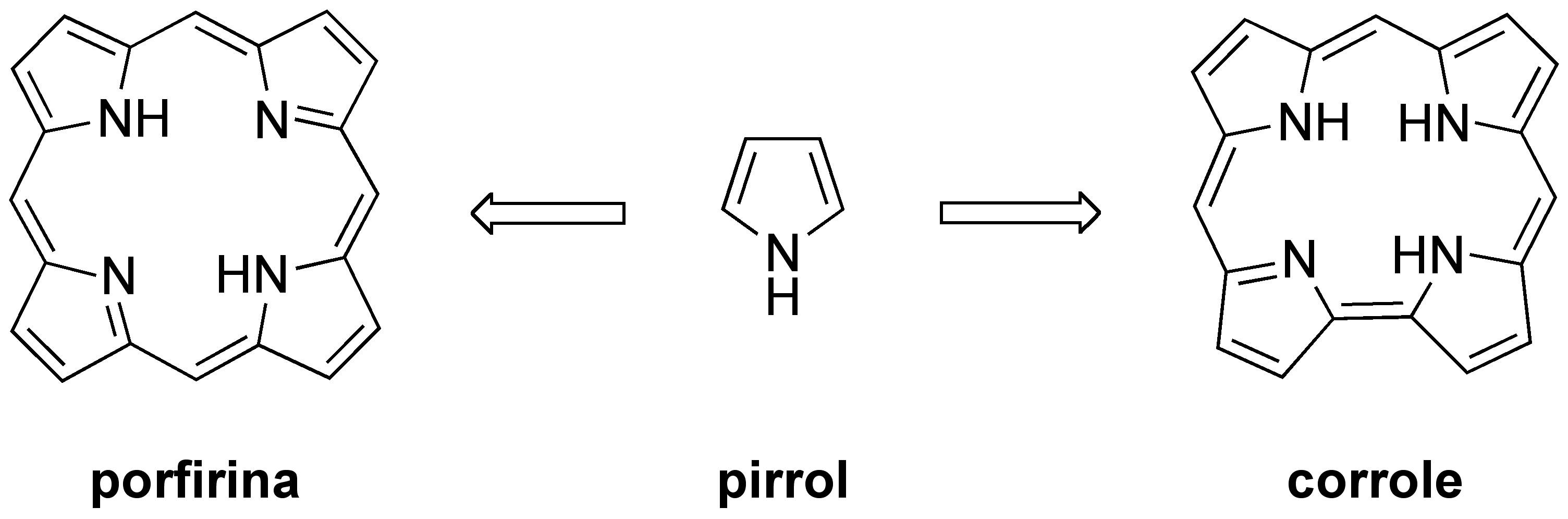 Corroles i porfirines són compostos basats en grups de pirrol (C4H5N, Figura central), que són grups aromàtics i quatre d’ells poden formar una porfirina (Figura esquerra). Aquestes porfirines són més conegudes pel fet que s’enganxin metalls de transició (com per exemple ferro) i així es forma el grup hemo. Aquest últim es troba a tot arreu, però els exemples més coneguts són dins les proteïnes hemoglobina i mioglobina, que són dins el cos humà responsables per transportar oxigen.