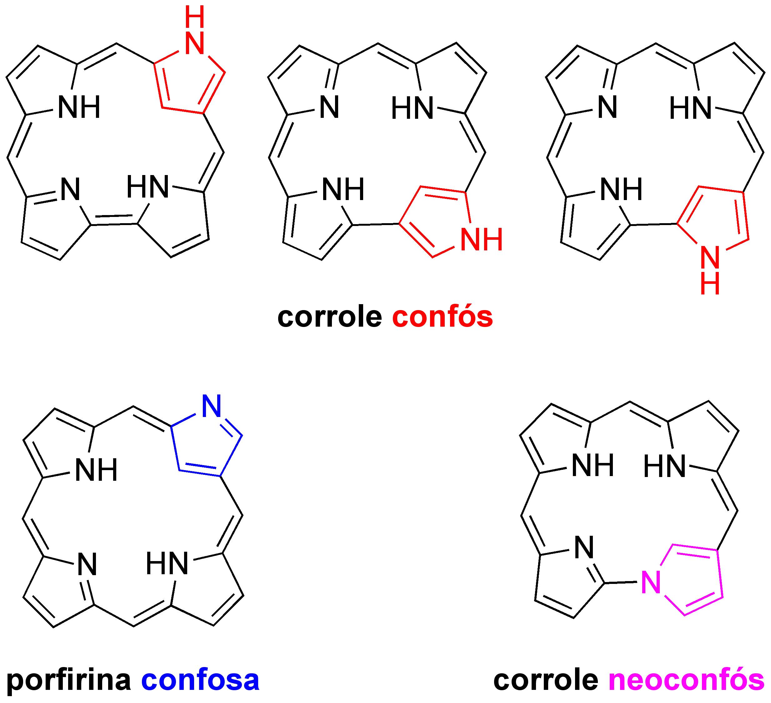 Tant els corroles com les porfirines a vegades es troben “confosos” en el sentit de que hi ha un grup pirrol que no s’ha enganxat correctament (Figura). Això significa que aquest grup s’ha girat amb el nitrogen a fora i amb un carboni cap a dins. Aquesta confusió té clarament un efecte dramàtic pels metalls de transició, que en canvi de quatre nitrogens ara només en trobem tres. Però, les propietats optiques també es veuen afectades.
