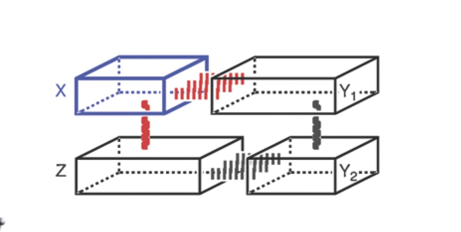 Així que podriem disimular que passa quan tenim un template en el qual un nou nucleòtid ha d’entrar per allargar la copia de l’ADN (el nou nucleòtid està indicat pel cub en blau en la primera figura, a l’esquerra; els altres tres cubs en gris representen els nucleòtids que ja són presents dins el sistema del template). El sistema real és més com indicat a la segona figura on a l’esquerra tenim la cadena d’ADN que s’estan copiant, a la dreta a baix tenim dos nucleòtids que ja s’han incorporat, i a dalt a la dreta (indicat amb el cuadre) tenim el nucleòtid que és el següent que s’incorpora, o no.