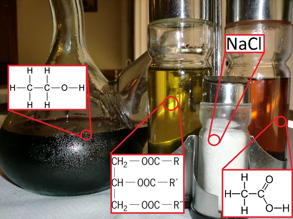 Tal i com hem mencionat, aquestes només són algunes de les molècules més representatives que trobem en cadascun d’aquests recipients quotidians de sobretaula. Hem posat una estructura general pel triacilglicèrid (podem substituir els grups R dels tres àcids grassos esterificats al glicerol) i la molècula d’etanol l’hem dibuixat plana, tot i que no es disposa així a l’espai.
