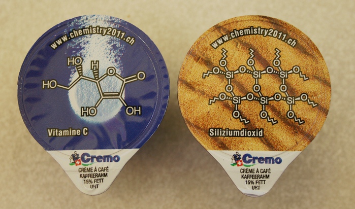 L’empresa de productes lactis Crémo s’ha volgut sumar d’aquesta manera a la celebració de l’Any Internacional de la Química. Les seves etiquetes representen diferents molècules que es troben sobretot en plantes; olis essencials, sucres, aigua, i el diòxid de silici com a principal excepció (una petita concessió als químics inorgànics).