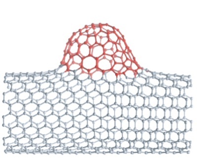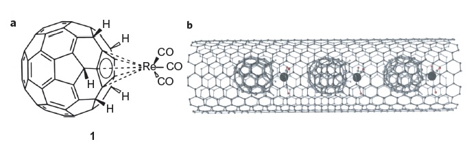 Malgrat que la cara externa del nanotub sigui la més reactiva, aquests investigadors han demostrat que els nanotubs també poden reaccionar per la cara interna. Per això varen sintetitzar nanotubs als quals  hi varen introduir molècules de ful·lerè coordinades amb Re(CO)3, concretament, Re(μ5-C60H5)(CO)3 (veure Figura 2).