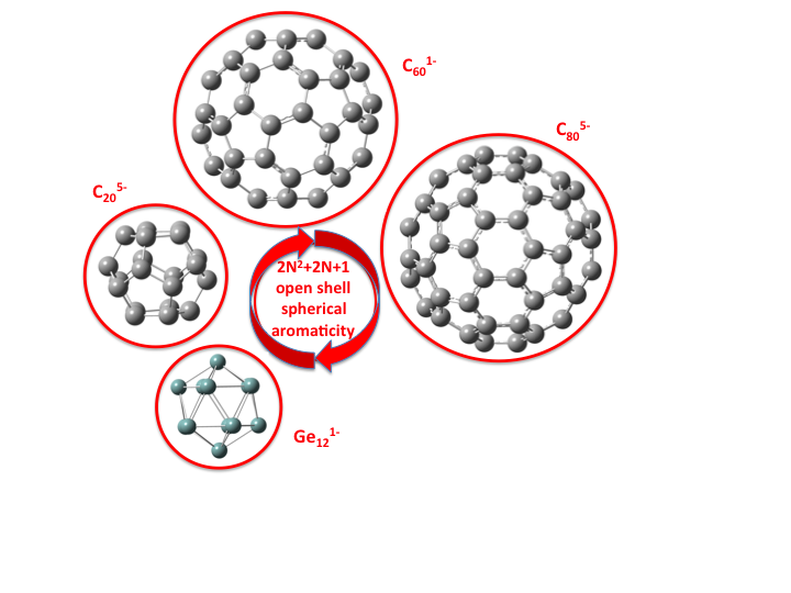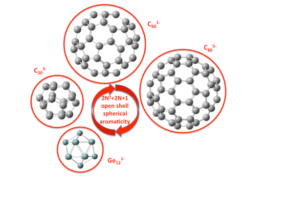 El 2000 Andreas Hirsch i col·laboradors varen trobar una regla per predir l’aromaticitat dels sistemes esfèrics, coneguda com la regla 2(N+1)2. Seguint la mateixa filosofia utilitzada per Baird per estendre la regla de Hückel a sistemes capa oberta, els autors d’aquest treball proposen ampliar la regla de Hirsch a sistemes esfèrics capa oberta. Així, els compostos de simetria esfèrica que omplin fins a la meitat el nivell d’energia més alt amb electrons del mateix espín, és a dir, aquells amb 2N2+2N+1 electrons i espín N + ½, haurien de ser aromàtics. Estudis computacionals basats en l’anàlisi dels índexs de deslocalització multicèntrics, l’anàlisi de la geometria dels sistemes, i càlculs de desplaçament químic independent del nucli, NICS per les seves sigles en anglès, avalen aquesta hipòtesi i demostren que sistemes com el C6019+ (S = 9 / 2) i C601-(S = 11 / 2) tenen un caràcter clarament aromàtic (Figura 1). Aquesta nova regla de aromaticitat podria resultar una eina útil per al desenvolupament d’imants moleculars.