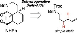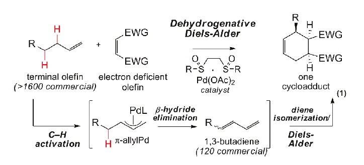 El procediment tradicional té lloc a través d’una activació de l’enllaç C-H, per a continuació seguir amb una β-eliminació d’hidrur i acabar amb una reacció Diels-Alder. Els dos primers pasos permeten generar el diè. El problema és que generalment aquest diè pot dimeritzar i per tant s’ha de separar el monòmer del dimer el que fa que els rendiments no siguin massa bons. El procés dissenyat pel grup de la Prof. White té lloc en presència d’un catalitzador de Pd i en un sol pas de reacció es produeix la necessària deshidrogenació per formar el diè i la consegüent reacció de Diels-Alder. Tot el procés té lloc amb un bon rendiment i aconsegueix transformar olefines terminals en productes cíclics de certa complexitat molecular. D’aquesta manera els investigadors de la Universitat d’Illinois han aconseguit sintetitzar en un sol pas molècules complexes com ara hidroisoindolines, cis-decalines, hidroisoquinolines, isoindoloquinolines i d’altres productes naturals complexos.