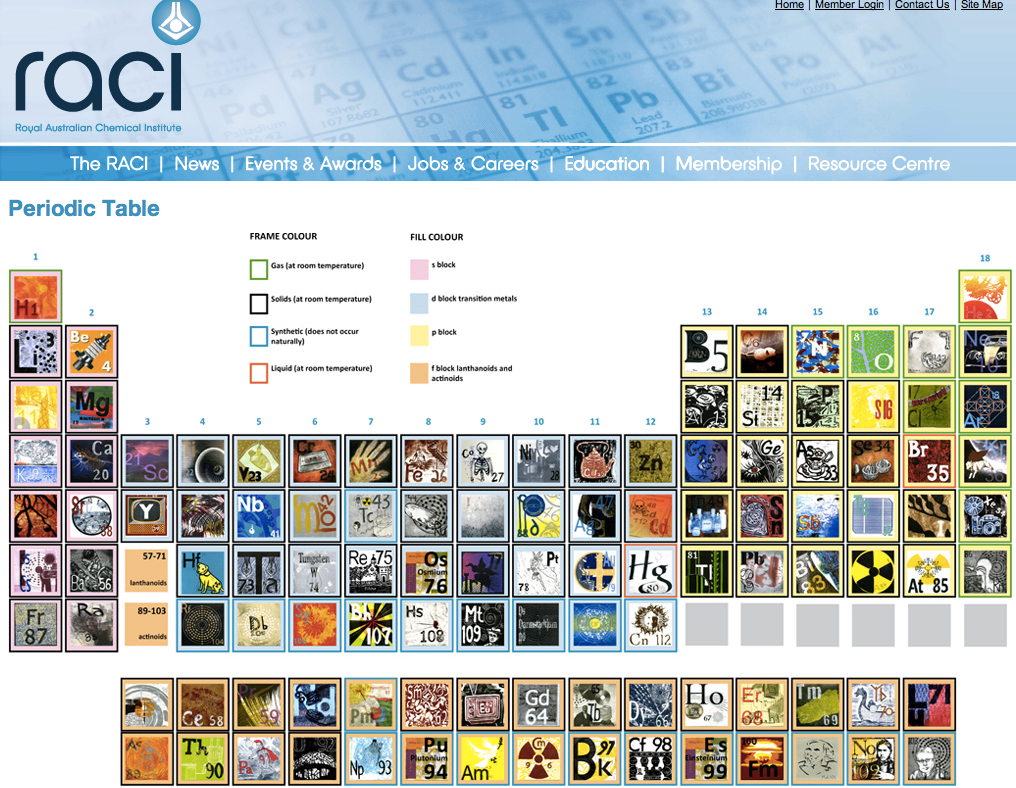 To celebrate the International Year of Chemistry in 2011, 79 chemists and 38 Tasmanian printmakers have joined in researching and then representing aspects of three randomly allotted elements from the 2010 official IUPAC Periodic Table of 112 elements. Chemists prepared background information to assist the artists in their interpretation of each element.