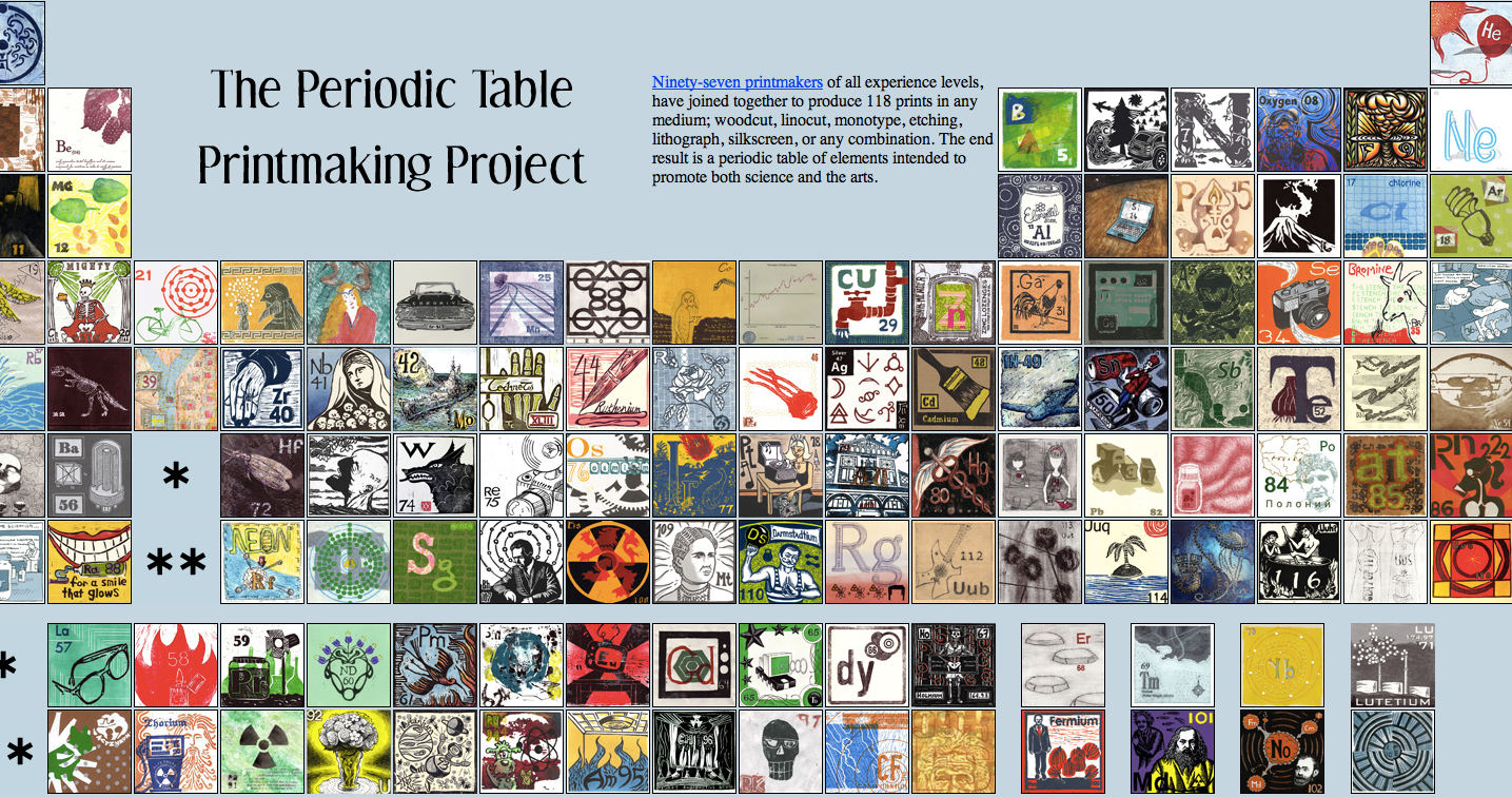 Ninety-seven printmakers of all experience levels, have joined together to produce 118 prints in any medium; woodcut, linocut, monotype, etching, lithograph, silkscreen, or any combination. The end result is a periodic table of elements intended to promote both science and the arts.
