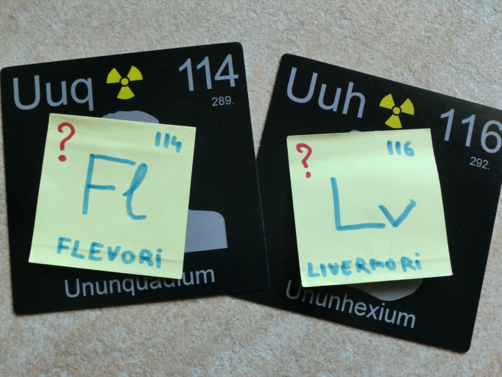 Abans d’ahir en parlàvem i, per la seva importància a la història de la Química (història que estem vivint al nostre present), la Foto Química d’aquesta setmana ens recorda que la IUPAC acaba d’iniciar el procés pel qual la comunitat química mundial ha d’aprovar la proposta dels noms per dos nous elements de la Taula Periòdica. Es proposa el nom de flevori amb el símbol Fl per l’element 114 i el de livermori (Lv) pel 116.