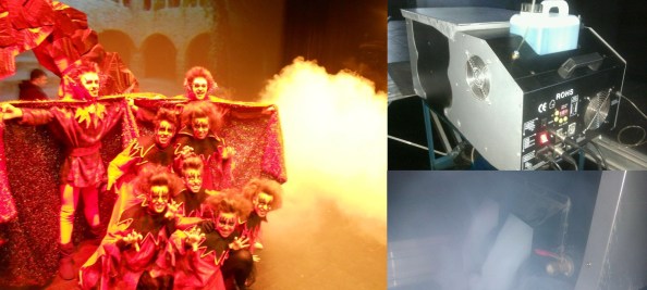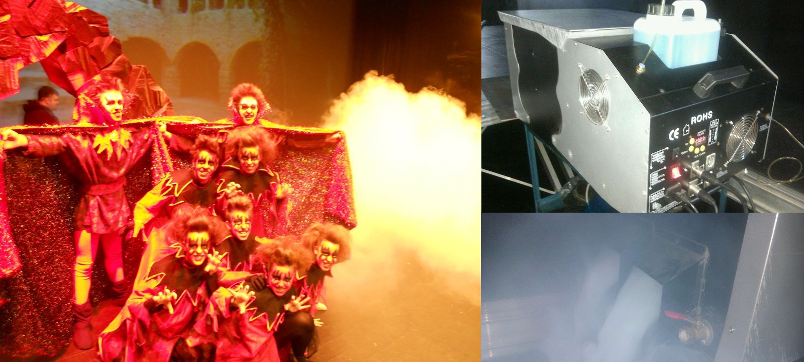 Per bé que també es pot generar boira amb la condensació del vapor d’aigua de l’atmosfera, produida per una font freda (com per exemple gel sec o nitrogen líquid), a les representacions teatrals s’utilitzen màquines comla que veiem a la imatge, les quals funcionen cremant un “liquid de fum” (tal i com indica a l’etiqueta de l’ampolla), el qual no és més que un poliol, el més conegut i emprat dels quals és al glicerina, mesclat amb aigua. A més a més, la màquina de fum de la imatge, després de generar el vapor de poliol, aquest passa per un tanc on hi ha glaçons de gel, per tal de que el fum baixi (tal i com apreciem a la fotografia inferior), generant l’efecte de boira baixa, arran de terra, i no es dispersi per l’escenari (també tenim altres màquines que no tenen aquest tanc de gel, per quan interessa generara una atmosfera boirosa).