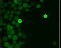 Figura 3 Imatge de microscòpia de fluorescència d’una barreja de derivats de l’Hèlix III sotmeses a un assaig per veure quines d’elles eren capaces de donar estructures actives. Les dos unitats de resina fluorescents contenen derivats de l’Hèlix III que, en presència de les Hèlix I-II en dissolució, plegaven com el domini B natural i eren capaces d’unir inmunoglobulina marcada amb fluorescència.