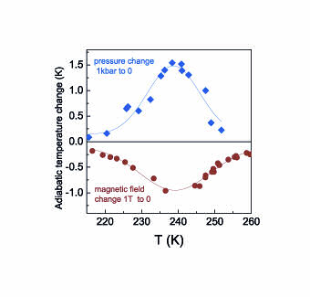 Sota el títol Inverse barocaloric effect in the giant magnetocaloric La–Fe–Si–Co compound a la revista Nature Communications s’ha publicat un article on investigadors catalans descriuen un nou material que presenta l’efecte barocalòric invers a temperatura ambient. Aquest material es refreda quan se li aplica pressió, al contrari del que succeeix en la majoria de materials.