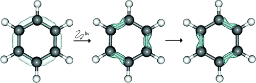 Figura 3. Amb el làser els investigadors aconsegueixen passar d'un benzè deslocalitzat a un localitzat de tipus Kekulé.
