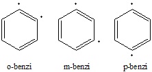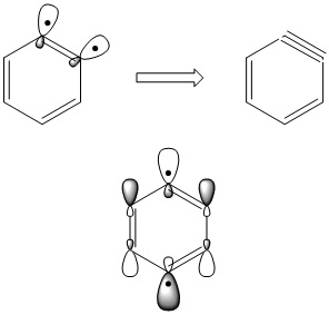 Bé, doncs quan tenim un biradical, podem tenir una situació en la que els dos electrons desaparellats no interaccionen o bé els dos electrons desaparellats poden interaccionar i donar lloc a un enllaç parcial. Això últim és el que passa en l’orto benzí (veure Figures 3 i 4). L’orto benzí resulta de dissociar homolíticament dos enllaços C-H del benzè en C situats en orto. El biradical que resulta interacciona i dóna lloc a un enllaç C-C més fort que els de la resta. Hi ha dos fets experimentals que ens permeten corroborar aquesta situació. Primer, la geometria. L’enllaç C-C que conté el biradical és més curt que la resta d’enllaços C-C de l’anell. Segona, l’energia dels estats singlet i triplet. Com que el biradical triplet no pot formar enllaç és significativament (> 10-20 kcal/mol) menys estable que el biradical singlet. Una cosa semblant els hi passa als benzins meta i para, però de manera no tant acusada.