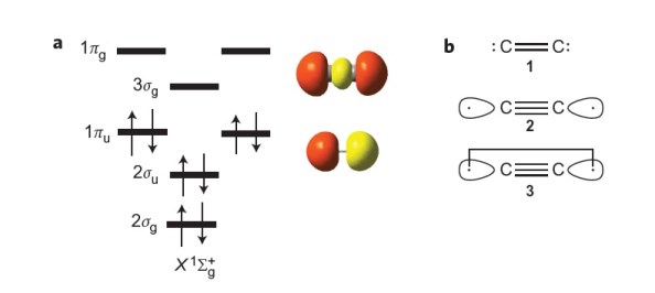 Comentàvem en una entrada del 27 d’agost sobre les diferents formes en les que ens podem trobar la molècula de C2 a la natura. En aquella entrada explicàvem que el C2 en l’estat fonamental presenta una distància d’enllaç de 1.2425 Å i un enllaç doble π sense enllaç σ. Es dels pocs casos on es prefereix un enllaç π a un de σ. Aquesta configuració és la que s’obté quan s’omplen els orbitals moleculars d’una molècula diatòmica com el C2 (veure Figura 1a). El resultat és una molècula de C2 amb una estructura de Lewis com la 1 de la Figura 1b, amb un enllaç doble π sense enllaç σ. La presència de dos electrons en l’orbital enllaçant 2σg que portaria a la formació de l’enllaç σ queda compensada per l’existència de dos electrons en l’orbital antienllaçant 2σu*, de manera que com a resultat final no tenim enllaç σ.