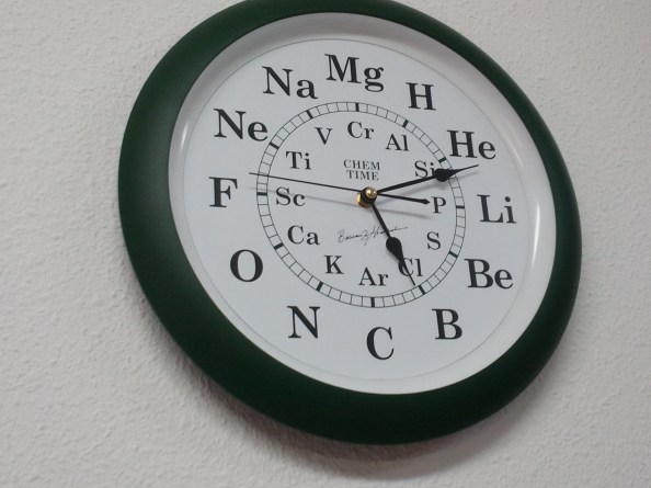 Dijous passat vaig tenir la possibilitat de visitar el Prof. Nazario Martín, catedràtic de la Universitat Complutense de Madrid, i des d’aquest passat dimarts flamant Premi Jaume I de Recerca Bàsica, un dels premis científics més prestigiosos. Doncs bé en el seu despatx s’hi troba aquest magnífic rellotge “Chem Time” que avui constitueix la foto química de la setmana. Estaria molt bé que el proper cop que ens preguntin l’hora responguéssim dos quarts de magnesi o tres quarts de Li.