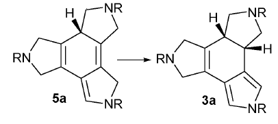 D’exemples on una molècula d’aigua explícita actua de catalitzador bifuncional ajudant a la transferència d’un protó n’hi ha molts. Menys freqüent és el cas on la molècula d’aigua fa el mateix paper però transferint un àtom d’hidrogen (un H· radical). L’any 2010 vàrem publicar un treball conjunt amb el grup de la Prof. Anna Roglans del grup de recerca METSO de la UdG en el que estudiàvem una reacció de cicloisomerització de dos triples enllaços i un enllaç doble per formar un anell de ciclohexadiè que no requeria la presència d’un catalitzador (a diferència del que passa normalment). En aquesta reacció hi havia una transferència 1,3 d’hidrogen (pas 5a a 3a en la Figura 4) que vàrem calcular que tenia una barrera molt alta. Després de provar diferents funcionals, bases de càlcul, etc. vàrem concloure que no era un problema del mètode de càlcul. Amb poca convicció vàrem provar la possibilitat que una molècula d’aigua actués com a catalitzador bifuncional, però ara per transferir un àtom d’hidrogen, no un protó. La barrera catalitzada per una molècula d’aigua va baixar més de 40 kcal/mol! L’estat de transició és el que es pot veure a la Figura 5. El resultat teòric es va poder confirmar experimentalment utilitzant aigua deuterada i veient que s’incorporava un àtom de deuteri en el producte final. A més cal tenir en compte que al fer-se la reacció a reflux és inevitable que hi hagi traces de molècules d’aigua a la reacció.