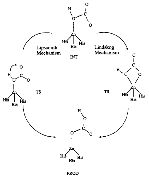 Hi ha reaccions, però, en les que l’aigua no té un paper d’espectador sinó que juga un rol més actiu i intervé directament en la reacció química. Hi ha molts d’exemples, però per il·lustrar-ho escolliré la reacció de transferència protònica que té lloc en l’anomenat mecanisme de Lipscomb que opera en l’enzim anhidrasa carbònica i que vàrem estudiar en el grup del Prof. Bertran l’any 1992. Aquest enzim catalitza la transformació del CO2 (diòxid de carboni) a HCO3– (bicarbonat) i ho fa a través de dos possibles mecanismes: el de Lipscomb i el de Linsdkog (veure Figura 2). En absència de molècules d’aigua el mecanisme de Lipscomb passa a través de l’estat de transició TS_(a) de la Figura 3 i no és competitiu amb el de Lindskog que té una barrera molt més baixa. Tanmateix, si la transferència protònica ve ajudada per una molècula d’aigua (TS_(b) de la Figura 3), la barrera del mecanisme de Lipscomb disminueix de manera molt substancial (i per tant l’aigua catalitza el procés) i passa a ser competitiu amb el mecanisme de Lindskog. La raó l’hem de buscar en el fet que la transferència protònica en el TS_(a) es fa a través d’un anell de 4 membres (O1H1O2C) que està molt tensionat, mentre que en el TS_(b) es genera un anell de 6 membres molt menys tensionat. En el TS_(b) l’aigua dóna un protó al CO2 i n’accepta un altre del grup L3ZnOH, és a dir, fa de catalitzador bifuncional (l’aigua actua com acceptora i donadora de protons en un procés simultani).