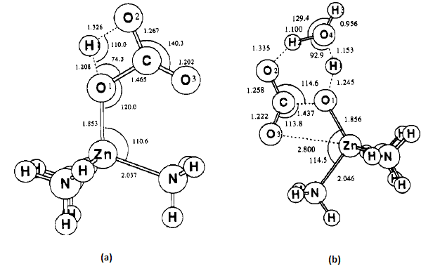 Figura 3. L’estat de transició del mecanisme de Lipscomb (a) sense aigua i (b) amb una molècula d’aigua.