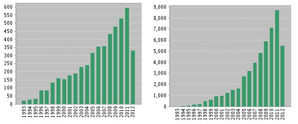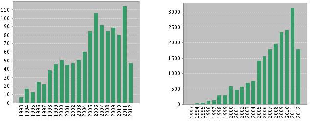 La base de dades de l’ISI-WOK també permet conèixer el nombre d’articles publicat per una determinada institució, bé sigui una universitat, un centre de recerca, un departament, etc., així com el número de cites que han rebut aquests articles. En la Figura 1 de l’esquerra es mostren els articles que han publicat investigadors de la Universitat de Girona des de la seva creació. En la Figura 1 a la dreta es mostren les cites que aquests articles han rebut. S’observa el perfil típic d’una Universitat jove amb un creixement constant que encara no s’ha estabilitzat. Des del seus inicis la UdG ha publicat en els àmbits de Ciències, Tecnologia, Ciències Socials i Humanitats un total de 4989 articles (només en falten 11 pels 5000!). A l’any 2011 el número d’articles publicats a la UdG ha ratllat els 600. Si mirem les cites, el número total de cites que han rebut aquests articles ha estat de 50336, 8712 corresponents a l’any 2011.